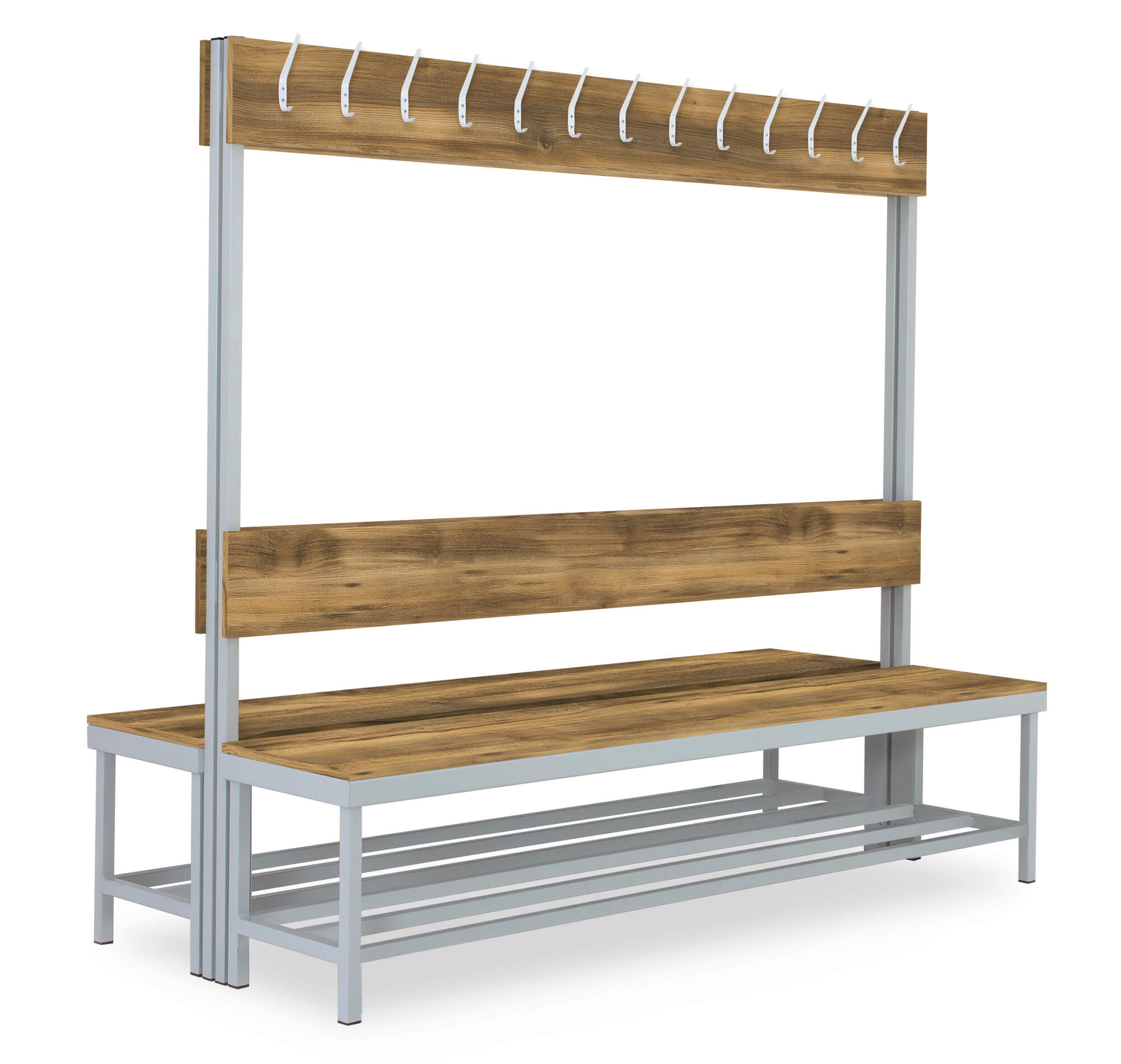 Oboustranné šatní lavice s věšáky, které vyrábíme v kombinaci robustního ocelového profilu a laminované dřevotřísky, slouží jako vybavení šaten pro provozy, tělocvičny, školy a sportovní kluby.