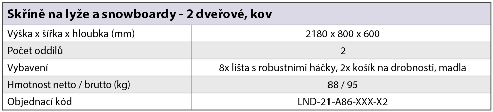 Skříně na lyže a snowboardy, které lze dovybavit příslušenstvím, jsou určené pro vybavení lyžáren hotelů, penzionů a skidepotů v lyžařských areálech. Vyrábíme je z pozinkovaného ocelového plechu lakovaného odolnou práškovou barvou v základní barvě RAL 7035 (světle šedá), RAL 5005 (modrá) a RAL 9005 (černá).